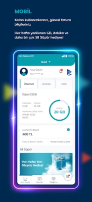 • You can review your remaining usage in your tariff and package from the Usages page of your mobile account, view your current invoice/balance, and earn GB, minutes and many other gifts by playing Sil Süpür with its gifts renewed every week.